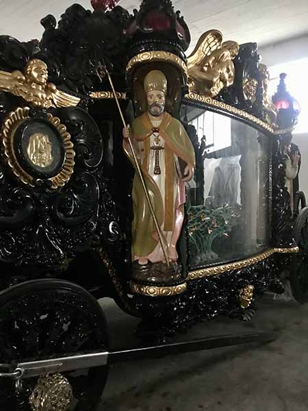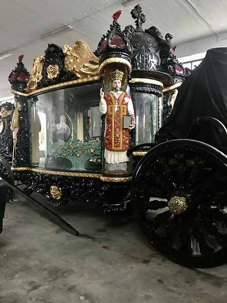 I’ve never seen anything like this and ask if I can take pictures. Being alongside them, I marvel at the craftmanship on display here. Painted in gloss black with bright gold trim, they’re like huge glass display-cases surrounded by oversized carved angels or priests (your choice) and embellished with lots of lanterns and such. Inside each sits a glass case mounted on an elevated ornate base for displaying the coffin. Morbid, yes, but utterly fascinating! The reason Rina has pulled in here is to pick up her sister who along with her brother-in-law own this funeral home.