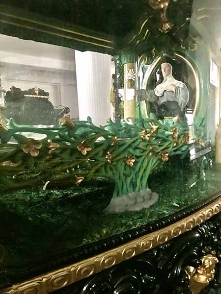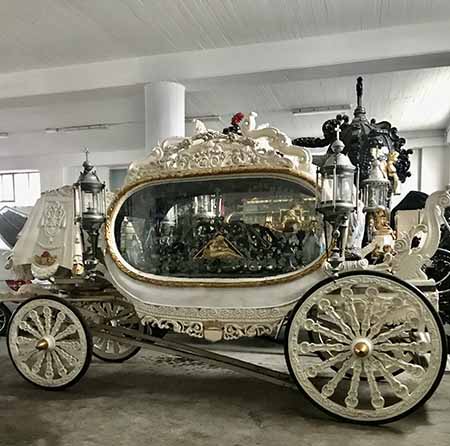 Lined up across the back wall are five or six massive glass-sided, ornately decorated carriages for carrying a coffin in a funeral procession. Most of them are horse-drawn, but one is mounted on a truck chassis so it can be driven. Except for one, all are black. The last one is all white and reminds me of Cinderella’s coach – only with large glass panels on each side. It’s slightly smaller than the others because it’s for babies and children.