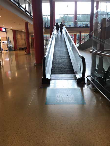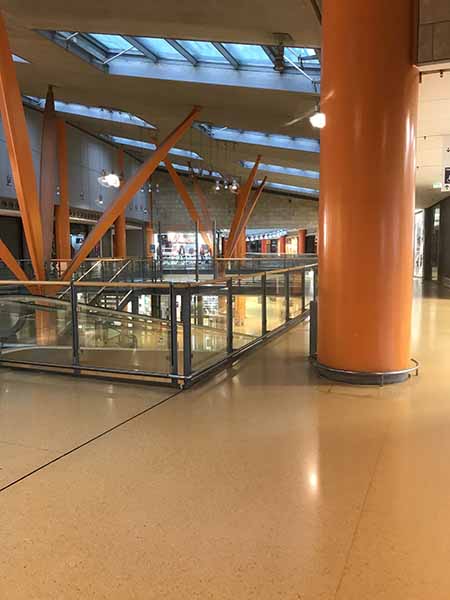 Back out in the mall, a very cool elevated moving sidewalk takes us to the upper level. I notice that the mall is laid out like a huge two-level doughnut with the hole being an open courtyard through which you can access other areas of the mall. Circling the parking areas as we leave, we pass the entrance to the mall and its large marque sign. It’s finally stopped raining so I can clearly see that the entire mall is hidden inside a gigantic grass-covered hill. And the name of the mall? Volcano!