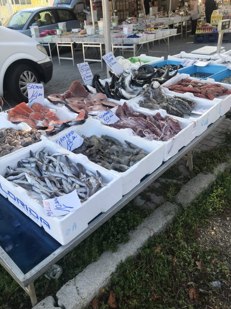 On the opposite side of the road is displayed every possible food product you can think of. Seafood alive and so fresh it’ll wink at you; every conceivable type of produce in season, forty types of nuts and olives, fresh baked breads still warm from the oven, all manner of candies, cookies, and pastries.