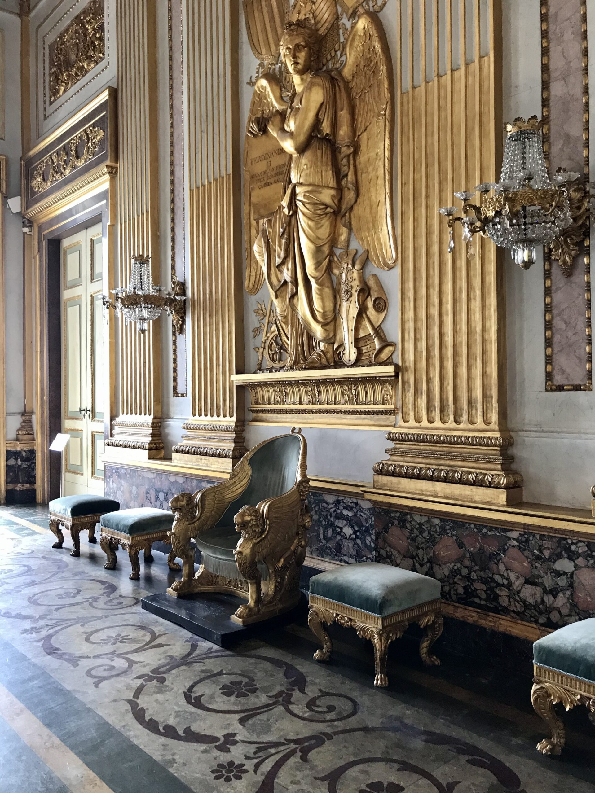 At the end of one wing, we enter the 132-foot-long throne room. Everything is gilded and meant to convey the absolute power of the sovereign. At the far end is the throne, and I must admit to being underwhelmed when I see it. With all that I’ve seen so far, I expect the throne to be spectacular, which it is not. It looks like an armchair covered in blue velvet and trimmed in well-worn, gilded wood. A strip of blue fringe hangs from the seat cushion adding a bit of whimsy.