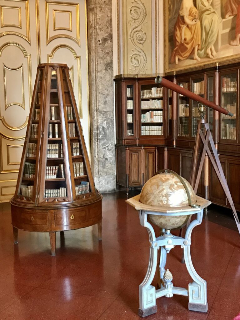 We continue with a bit more speed, giving each new room a once over, but lingering a bit when we peek at the royal nursery. Towards the end of the tour, we step into one of several bookcase-lined rooms which form the library. The bookcases are mostly glass-enclosed with the floor-level, lower shelves reserved for oversized atlases and such. Amid the usual furnishings of desks, chairs, oil reading lamps, telescopes, and globes, one peculiar bookcase stands out as it’s a free-standing, conical piece of furniture. Upon close inspection, we observe the books are authentic from the time period and original to the library. Also displayed here are the original 1756 drawing plans for the Royal Palace showing a vast open area in front for organizing and parading troops rather than the current formal gardens.