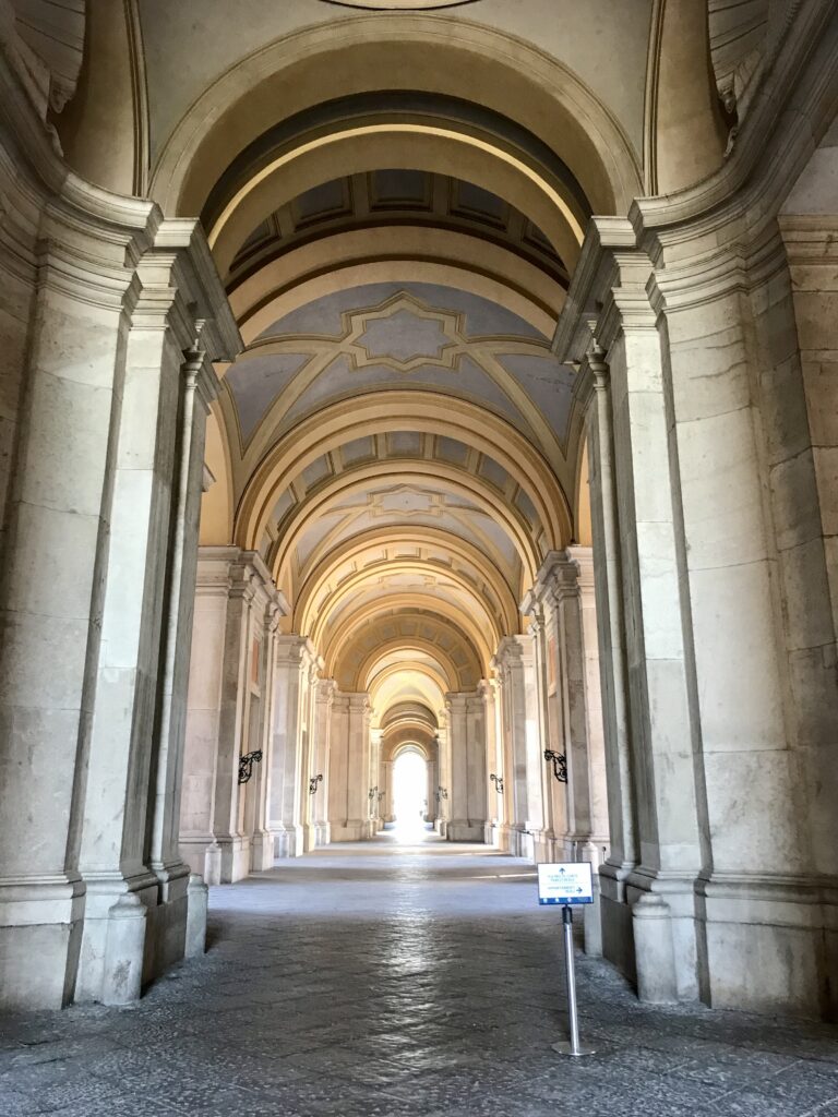 Back at the Palace, we walk along the nave to the point where the four courtyards intersect. From here, it’s possible to see all four courtyards at the same time. And it’s here that one enters the Palace by ascending a magnificent marble staircase of wide shallow steps flanked by two huge marble lions. Terminating at a back wall of the lower vestibule, the staircase forks into two parallel side ramps and continues up to the upper vestibule with its magnificently painted elliptical vault. We cross the upper vestibule and enter the opulent Royal Chapel where we immediately notice the damaged massive marble columns which have been left as a reminder of a WW2 aerial bombing.