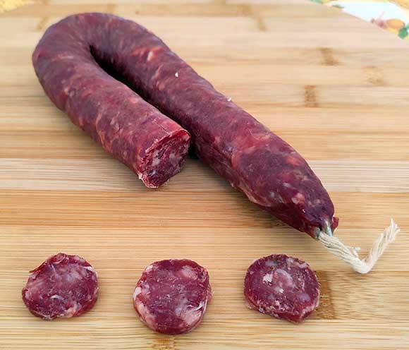 Made exclusively from selected cuts of pork, the sausage is seasoned with salt, black pepper, wild fennel seeds, and sweet or spicy peperone di Senise, which gives it its characteristic aroma and flavor. The mixture is stuffed into natural casings and left to dry slowly in the pure mountain air, a process that enhances its fragrance and preserves its authentic character.